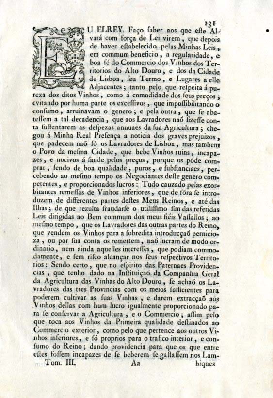 [PROIBIÇÃO DE ENTRAREM EM LISBOA VINHOS PRODUZIDOS FORA DO SEU TERRITÓRIO, COM EXCEPÇÃO DOS VINHOS DOCES DAS ILHAS DA MADEIRA E DO PICO].’Alvará com força de Ley, por que Vossa Magestade he // servido, naõ obstante os Paragrafos trinta e hum, e // trinta e quatro da Ley da Instituiçaõ da Companhia Geral da // Agricultura das Vinhas do Alto Douro prohibir, que na Ci- // dade de Lisboa se admittam a despacho Vinhos que naõ sejam // produzidos nos Territorios da mesma Cidade, seu Termo, e // Lugares a elle adjacentes, e os doces das Ilhas, da Madei- // ra, e do Pico, debaixo das penas, e na fórma assima decla- // rada’. [Dado no Palacio de Nossa Senhora da Ajuda, a dezesete de Outubro de mil setecentos sessenta e oito. Impresso na Officina de Miguel Rodrigues]. In-4º gr. de IV págs. inums. Desenc.