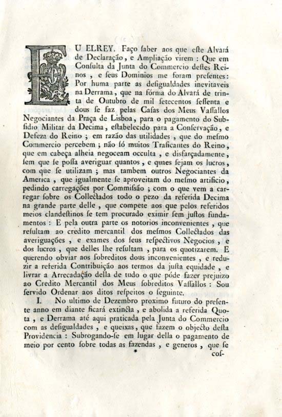 [DERRAMA PRATICADA PELA JUNTA DO COMÉRCIO COMO SUBSÍDIO MILITAR, APLICADA TAMBÉM À COMPANHIA DA AGRICULTURA DAS VINHAS DO ALTO DOURO].’Alvará, por que Vossa Magestade ha por bem entender // em termos habeis, declarar, restringir, e ampliar os // outros dous Alvarás de vinte e seis de Setembro, e de trinta // de Outubro do anno de mil setecentos sessenta e dous: Abolindo // a Quota, e a Derrama dos Commerciantes da Praça de Lis- // boa, respectivas á Contribuição do Subsidio Militar da Deci- // ma, e subrogando no lugar dellas as outras suaves Contribui- // ções no mesmo Alvará estabelecidas; tudo na fórma assima de- // clarada’. [Dado no Palacio de Nossa Senhora da Ajuda aos doze de Novembro de mil setecentos setenta e quatro, Na Regia Officina Typografica]. In-4º gr. de 8 págs. Desenc.