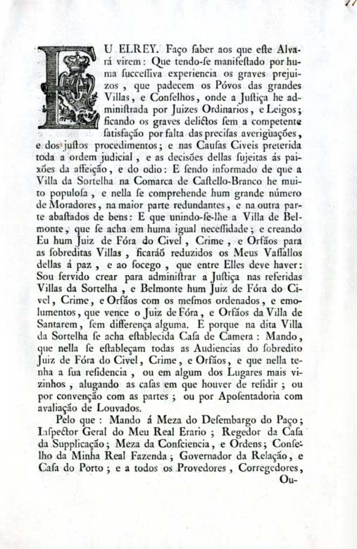 [SORTELHA E BELMONTE. CRIAÇÃO DE UM JUIZ DE FORA]. ‘Alvará, por que Vossa Magestade pelos motivos nelle // declarados he servido crear hum Juiz de Fóra do // Civel, Crime, e Orfãos para administrar a Justiça nas // Villas da Sortelha, e de Belmonte na Comarca de Castello- // Branco: Mandando, que tenha a sua residencia na sobredita // Villa da Sortelha, ou em algum dos Lugares mais vizi- // nhos; tudo na fórma assima declarada’. [Dado no Palacio de Nossa Senhora da Ajuda em tres de Junho de mil setecentos setenta e seis. Na Regia Officina Typografica]. In-4º gr. de IV págs. inums. Desenc.