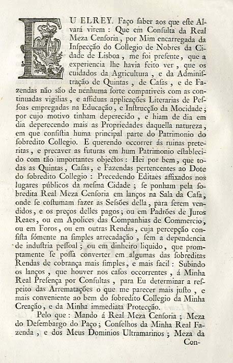 Alvará autenticado com a assinatura impressa do Marquês de Pombal, declarando "que os cuidados da Agricultura, e da Administração de Quintas, de Casas, e de Fazendas não são de nenhuma sorte compativeis com as continuadas vigilias, e assiduas applicações Litterarias de Pessoas empregadas na Educação, e Instrucção da Mocidade; por cujo motivo tinham deperecido, e hiam de dia em dia deperecendo mais as Propriedades daquella natureza, em que consistia huma principal parte do Patrimonio do sobredito Collegio. E querendo occorrer ás ruinas preteritas, e precaver as futuras em hum Patrimonio establecido com tão importantes objectos: Hei por bem, que todas as Quintas, Casas, e Fazendas pertencentes ao Dote do sobredito Collegio: Precedendo Editaes affixados nos lugares públicos da mesma Cidade; se ponham pela sobredita Real Meza Censoria em lanços na Sala da casa, onde se costumam fazer as Sessões della, para serem vendidos (…)". segundo a forma que o presente Alvará determina.