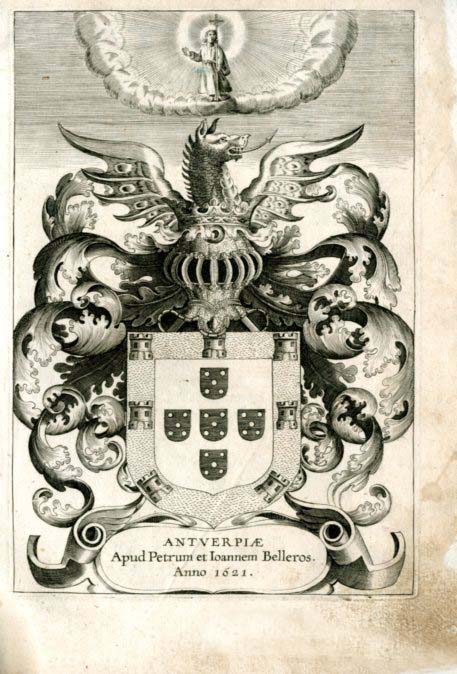 VASCONCELOS (António de) [1554-1622].— ANACEPHALÆOSES // id est, // SVMMA CAPITA // ACTORVM REGVM // LVSITANIÆ. // Auctore P. ANTONIO VASCONCELOS Societatis // IESV Sacerdote, Theologo Olysipponensi. // ‘Accesserunt Epigrammata in singulos Reges ab insigni // Poeta’ EMMANVELE PIMENTA // ‘eiusdem Societatis.’ // et illorum affigies ad viuum expressæ, curâ Maiestatis Aulici // Familiaris, Equitis militiæ Saluatoris nostri IESV // CHRISTI; & Domini de Voorde. // [pequena vinheta ornamental] // ANTVRPIÆ // Apud Petrum & Ioannem Belleros. // ANNO M.DC.XXI. // ‘Cum Gratia & Priuilegio.’ In-4.º de XVI-597-[I] (com erros de paginação)-XXIII-[I] págs. E.