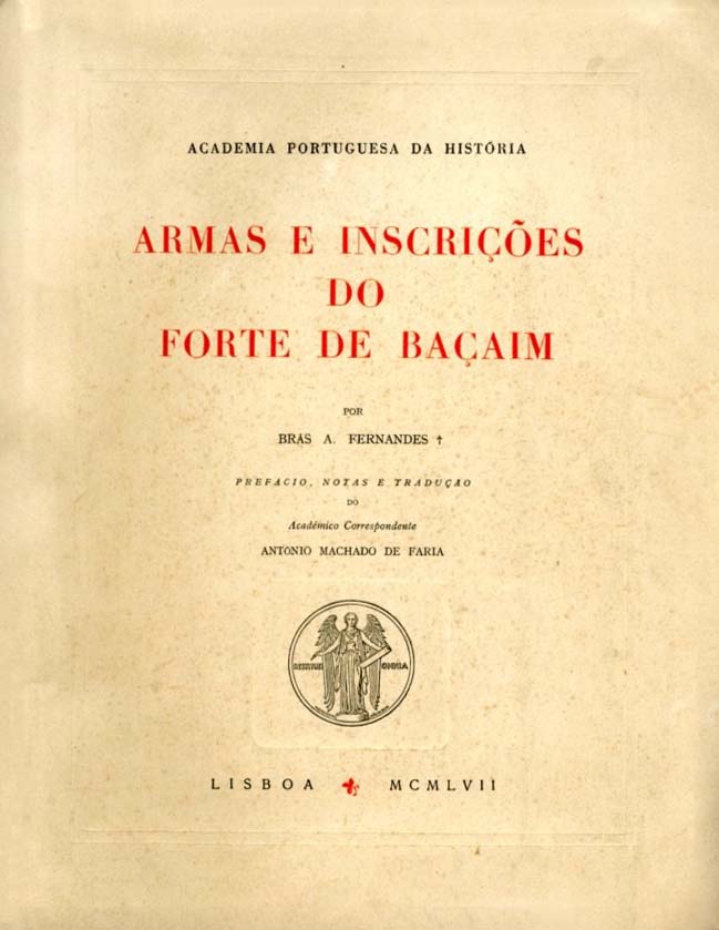 FERNANDES (Brás A.).— ARMAS E INSCRIÇÕES DO FORTE DE BAÇAIM. [Academia Portuguesa da História]. Prefácio, notas e tradução do Académico Correspondente António Machado de Faria. Lisboa. MCMLVII. In-4.º gr. de XXV-VII-282-II págs. B.