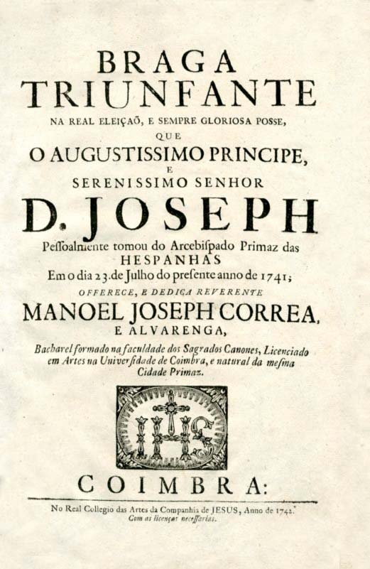 ALVARENGA (Manuel José Correia e).- BRAGA // TRIUNFANTE // NA REAL ELEIÇAÕ, E SEMPRE GLORIOSA POSSE, // QUE // O AUGUSTISSIMO PRINCIPE, // E // SERENISSIMO SENHOR // D. JOSEPH // Pessoalmente tomou do Arcebispado Primaz das // HESPANHAS // Em o dia 23. de Julho do presente anno de 1741; // OFFERECE, E DEDICA REVERENTE // MANOEL JOSEPH CORREA, // E ALVARENGA, // (…) // COIMBRA: // No Real Collegio das Artes da Companhia de JESUS, Anno de 1742. ‘Com as licenças necessarias. In-fólio de 136 págs. E.
