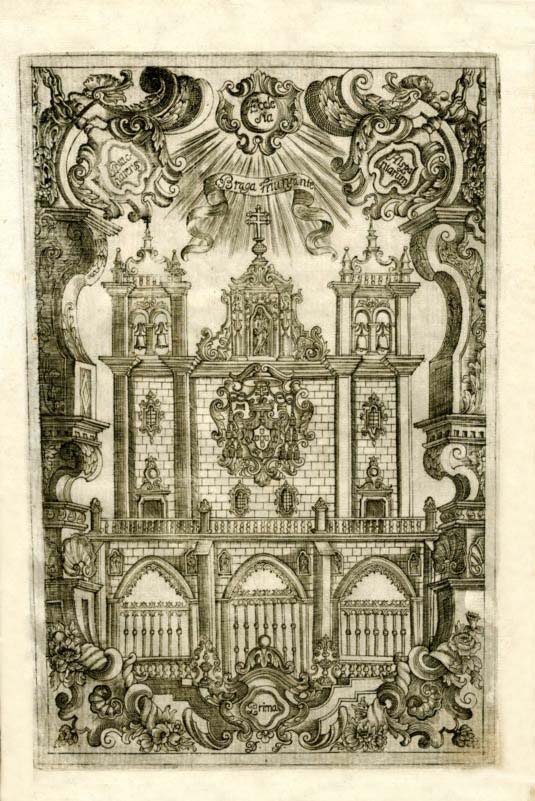 Interessante, rara e estimada obra da bibliografia bracarense, impressa em encorpado papel de linho, adornada de letras capitais de fantasia e vários cabeções de enfeite e de remate em boas gravuras abertas em madeira. Com uma muito bela e monumental portada aberta a buril em chapa de cobre que tem como principal motivo a fachada da Sé de Braga. (assinada D. F [Debrie?]).