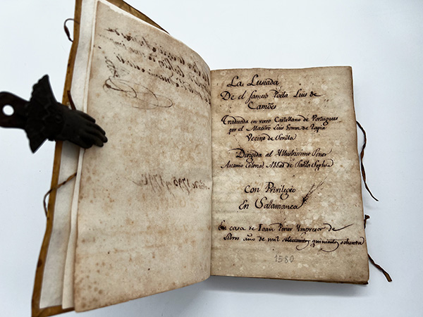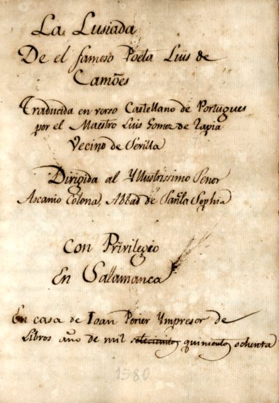 CAMOES (Luis de).— [MANUSCRITO]. La Lusiada // De el famoso Poeta Luis de // Camões // Traducida en verso Castellano de Portugues // por el Maestro Luis Gomez de Tapia // Vecino de Sevilla // Dirigida al Illustrissimo Senor // Ascanio Colona, Abbad de Santa Sophia // Con Privilegio // En Salamanca // En casa de Ioan Perier Impresor de // Libros año de mil setecientos [rasurado] quinientos ochenta. [dim. aprox. 16 x 21,5 cm] de XXXII-163-[I] págs. E.