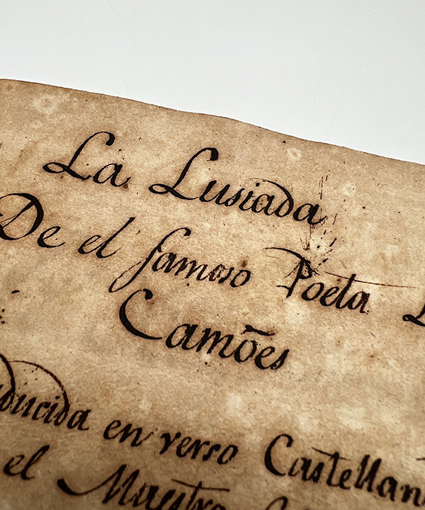 Fiel cópia manuscrita de uma das duas primeiras e concorrentes traduções em castelhano da célebre epopeia de Camões, minuciosamente caligrafada com tinta ferrogálica pela pena de Andres de Morales de los Rios. Ambas impressas no ano de 1580 a mando de Filipe II de Espanha, a primeira, da qual saiu o presente manuscrito, fôra impressa em Salamanca na oficina de Juan Perrier, com Luiz Gomes Tapia como tradutor e a outra, commumente conhecida como a primeira versão castelhana, com alvará concedido a 27 de Março, impressa em Alcalá na oficina de Juan Gracián e tradução de Benito Caldera.