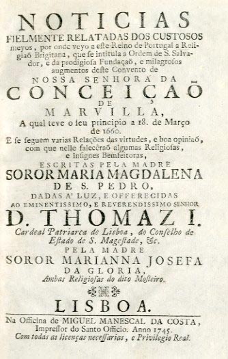 S. PEDRO (Soror Maria Madalena de).- NOTICIAS // FIELMENTE RELATADAS DOS CUSTOSOS // meyos, por onde veyo a este Reino de Portugal a Reli- // giaõ Brigitana, que se intitula a Ordem de S. Salva- // dor, e da prodigiosa Fundaçaõ, e milagrosos // augmentos deste Convento de // NOSSA SENHORA DA // CONCEIÇAÕ // DE // MARVILLA, // A qual teve o seu principio a 18. de Março // de 1660. // E se seguem varias Relações das virtudes, e boa opiniaõ, // com que nelle fallecêraõ algumas Religiosas, // e insignes Bemfeitoras, // ESCRITAS PELA MADRE // SOROR MARIA MAGDALENA // DE S. PEDRO, // DADAS Á LUZ, E OFFERECIDAS // AO EMINENTISSIMO, E REVERENDISSIMO SENHOR // D. THOMAZ I. // ‘Cardeal Patriarca de Lisboa, do Conselho de // Estado de S. Magestade, &c.’ // PELA MADRE // SOROR MARIANNA JOSEFA // DA GLORIA, // ‘Ambas Religiosas do dito Mosteiro’. // LISBOA. // Na Officina de MIGUEL MANESCAL DA COSTA, // Impressor do Santo Officio. Anno 1745. In-8.º gr. de XXXII-267-I págs. E.