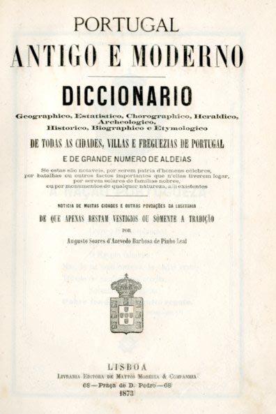 LEAL (Augusto Soares de Azevedo Barbosa de Pinho) & FERREIRA (Pedro Augusto).- PORTUGAL ANTIGO E MODERNO. Diccionario Geographico, Estatistico, Chorographico, Heraldico, Archeologico, Historico, Biographico e Etymologico de todas as cidades, villas e freguezias de Portugal e de grande numero de aldeias se estas são notaveis, por serem patria d’homens celebres, por batalhas ou outros factos importantes que nellas tiveram logar, por serem solares de familias nobres, ou por monumentos de qualquer natureza, alli existentes. Noticia de muitas cidades e outras povoações da Lusitania de que apenas restam vestigios ou somente a tradição. Lisboa. Livraria Editora de Mattos Moreira & Companhia. 1873-1890. 12 vols. In-4.º E.
