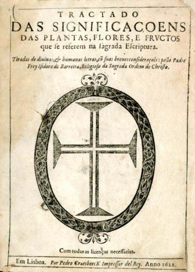 BARREIRA (Fr. Isidoro de).— TRACTADO // DAS SIGNIFICACOES // DAS PLANTAS, FLORES, E FRVCTOS // que se referem na sagrada Escriptura. // ‘Tiradas de diuinas, & humanas letras, cõ suas breues considerações: pello Padre // Frey Isidoro de Barreira, Religioso da Sagrada Ordem de Christo.’ // [gravura com tarja oval tendo ao centro a cruz da Ordem de Cristo] // Com todas as licenças necessarias. // Em Lisboa. ‘Por Pedro CraesbeecK [SIC] Impressor del Rey.’ Anno 1622. In-8.º gr. de XVI págs. prels. inums., 582 nums. e mais XX finais inums. E.